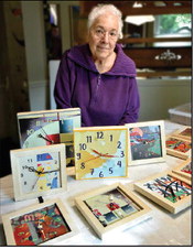 Radding, whose art is expressed through several media, makes what she calls “artful clocks” utilizing photos, paintings